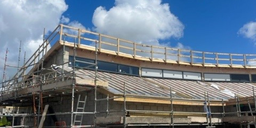 This build included the removal of the old garden area and pond. Foundations and slab were formed, including new drainage and ducting requirements for the school and connections. Steel and blockwork superstructure then formed the curved building and timber roof with a slate finish and single ply membrane on the flat roofs.